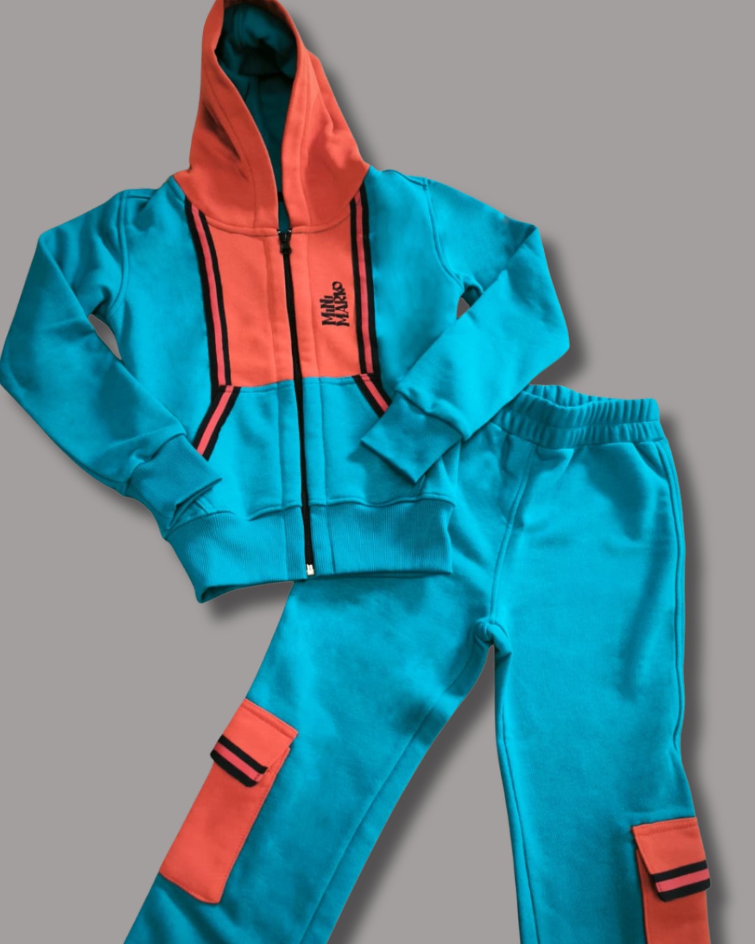 Trenirka izrađena od pamučne nečešljane felpe, sastava 100% pamuk. Sastoji se od gornjeg dijela s kapuljačom, patentnim zatvaračem i džepovima te donjeg dijela u dvije komplementarne boje. Na prednjoj strani je uvezen Minimarko logo.